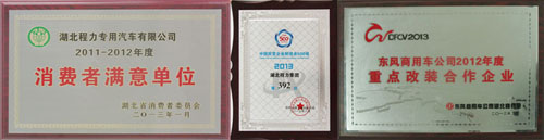 公司先后被金融機構評為AAA企業,被湖北省工商局評為“守合同重信用”企業,湖北省科技廳評為“具有發展潛力企業”、“國家高新技術企業”;公司黨委被湖北省省委組織部評為“全省非公有制企業雙強百佳黨組織”,省委、省政府授予“湖北省優秀民營企業” 等榮譽稱號;公司“程力威”牌灑水車被評為湖北省名牌產品;公司品牌“程力威”榮獲湖北省著名商標、中國馳名商標。