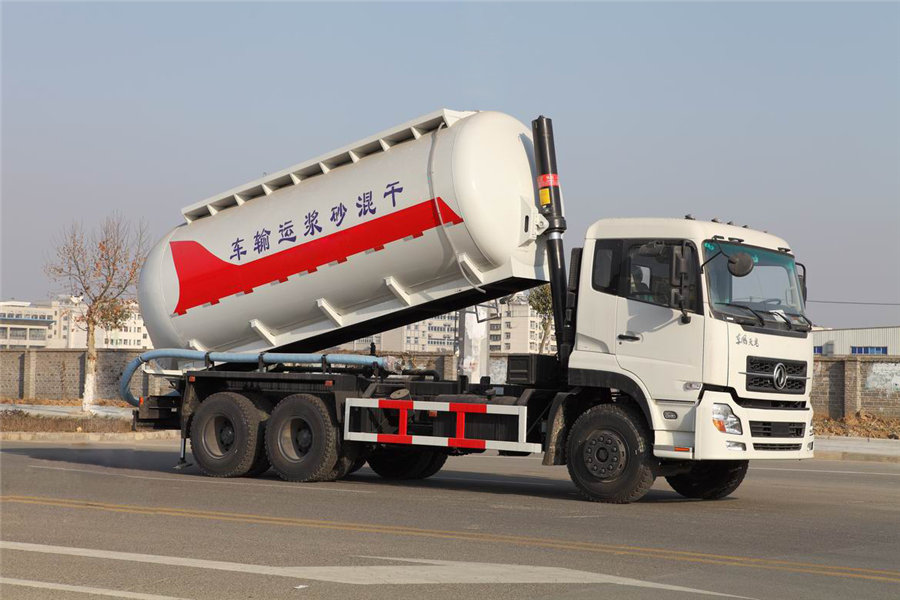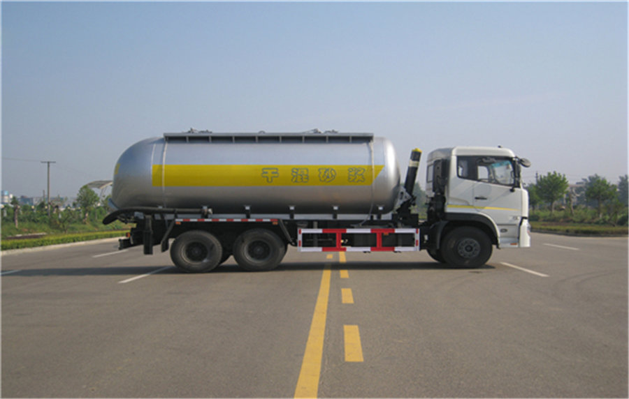 干混砂漿運輸車是一種配有氣力輸送裝置的儲料罐車,其主要功能是將干混砂漿生產(chǎn)廠攪拌好的散裝干混砂漿顆粒狀物料運送到工地,通過氣力輸送裝置將干混砂漿輸送到干混砂漿移動筒倉內(nèi),可實現(xiàn)干混砂漿顆粒狀物料的散裝運輸和自動卸料,是干混砂漿物料轉(zhuǎn)運物流系統(tǒng)中的關(guān)鍵設(shè)備之一。