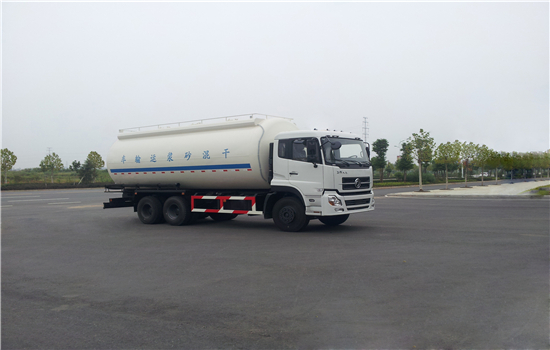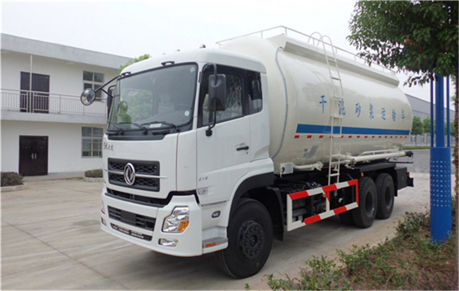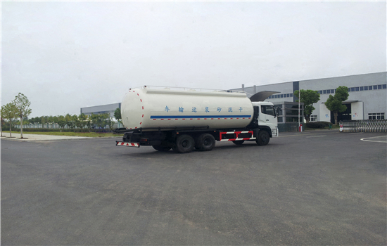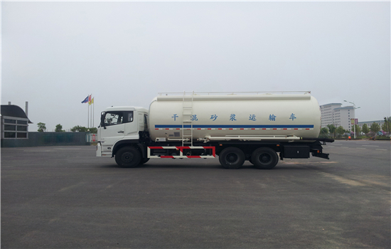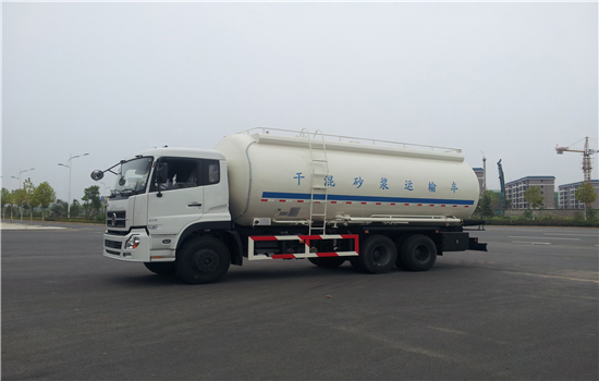 干混砂漿運輸車是一種配有氣力輸送裝置的儲料罐車,其主要功能是將干混砂漿生產廠攪拌好的散裝干混砂漿顆粒狀物料運送到工地,通過氣力輸送裝置將干混砂漿輸送到干混砂漿移動筒倉內,可實現干混砂漿顆粒狀物料的散裝運輸和自動卸料,是干混砂漿物料轉運物流系統中的關鍵設備之一。