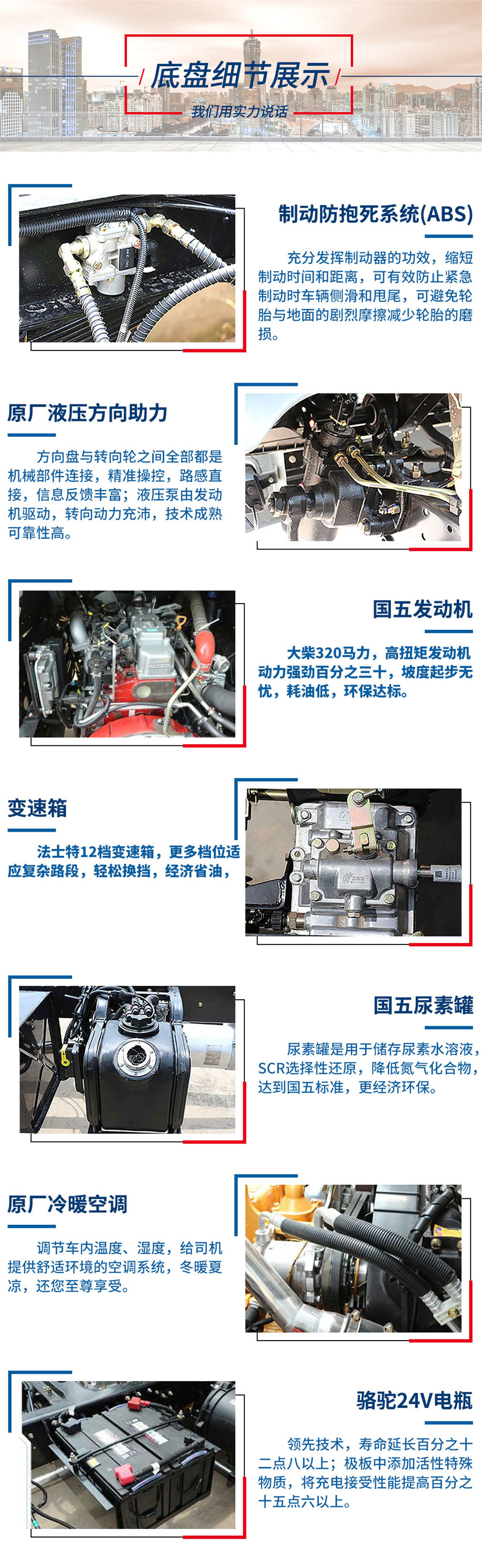 底盤配置:解放前四后八高頂新款駕駛室,大柴320馬力發(fā)動機,一汽10檔變速箱,1950+4550+1350mm軸距,11.00R20鋼絲胎,電動門窗,原廠空調(diào),ABS,方向助力,斷氣剎; |